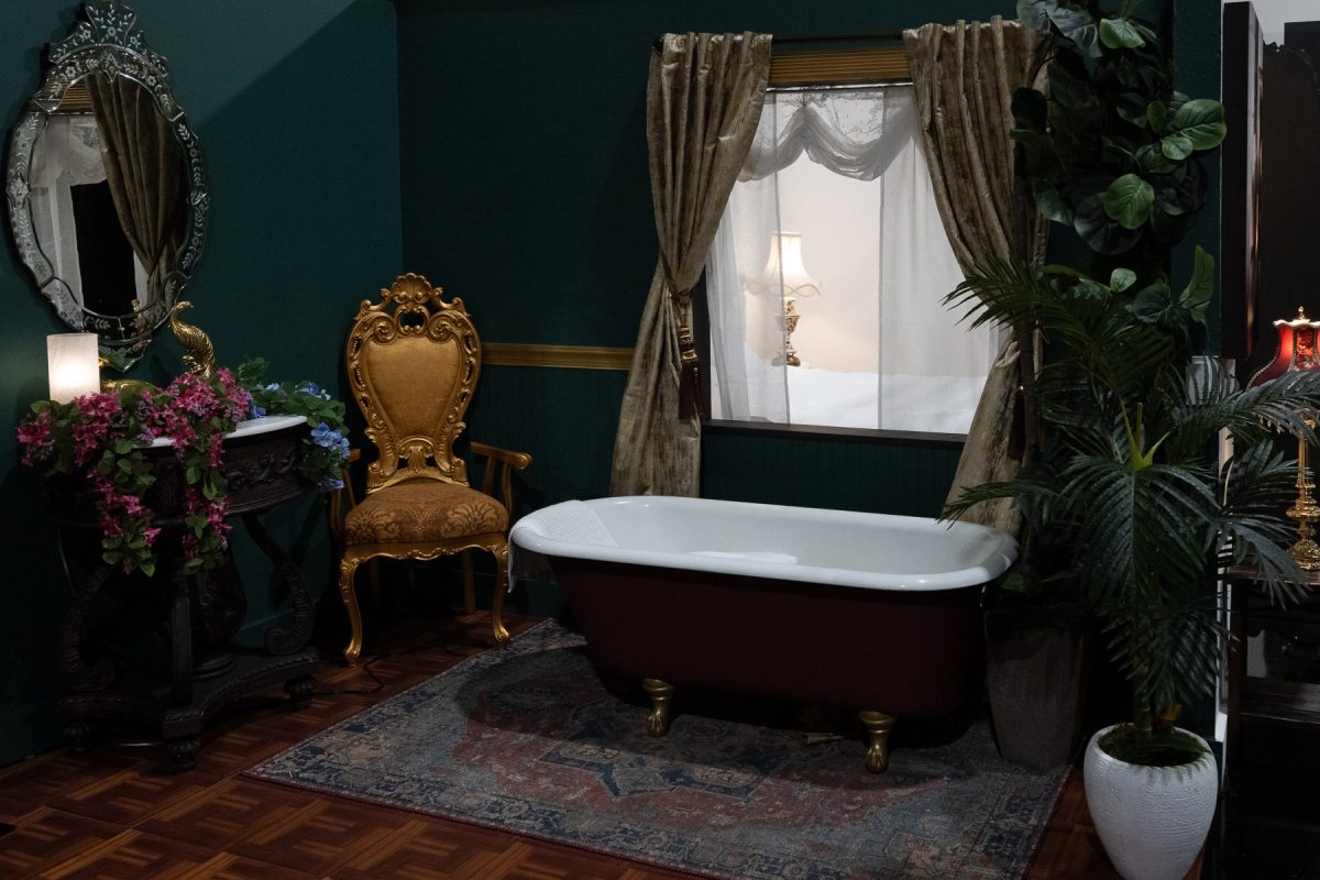 Fixed sets include Anastasia’s Red Room, the Boudoir Suite, the Venetian Bath, and an immersive 8×12 Rain Room.